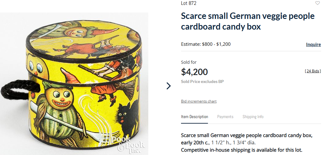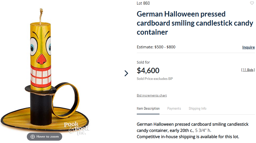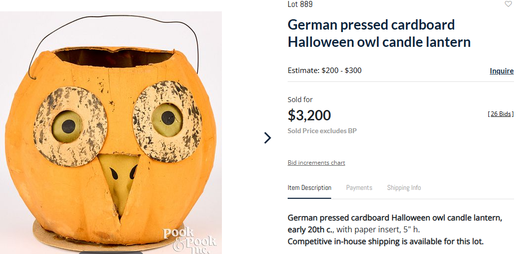Pook & Pook, Inc. in Pennsylvania held an auction of the Alice and Art Booth collection over several days with the Halloween lots being sold on April 17th. Final prices were reasonable overall - probably due to the very high buyer’s premium of 27%. (These auction houses really need to think about the viability of their business model as such high rates discourage participation.) One thing I appreciated is that the few lots that were partially or wholly comprised of modern items were clearly listed as being modern items, eliminating any confusion newer collectors may have experienced.