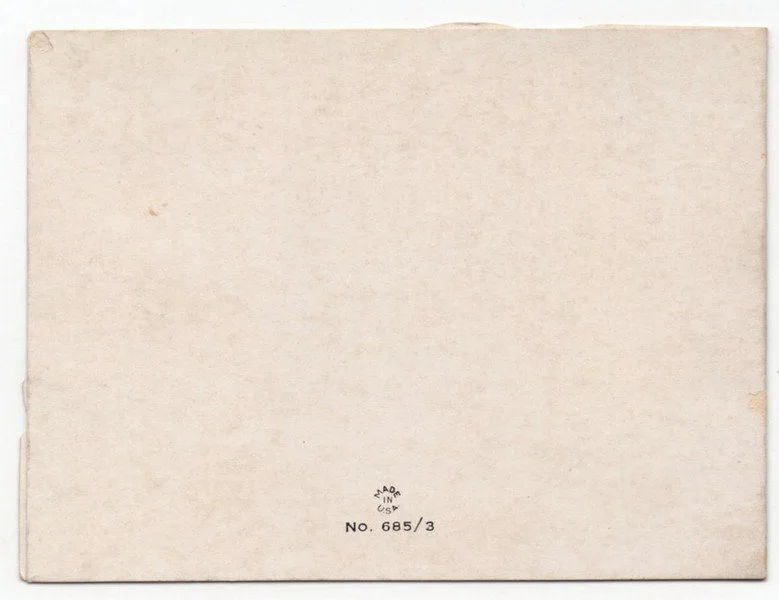 A-Meri-Card was a specific product line that American Greetings only used during the late 1940s. This unused witch-themed invitation was, of course, produced then. It measures ~2.75” high by ~3.75” across, closed. It has an assigned stock number of 685/3. The quality of the paper used by American Greetings for this product line was prone to delamination or chipping. It is common to see chipping on A-Meri-Card items. This specific invite has very minimal chipping. I like the use of grey-tone. Check out the cat’s expression.