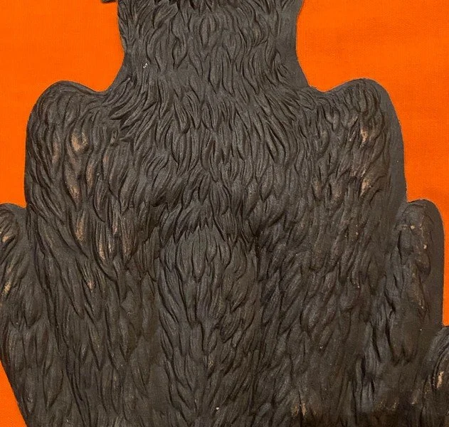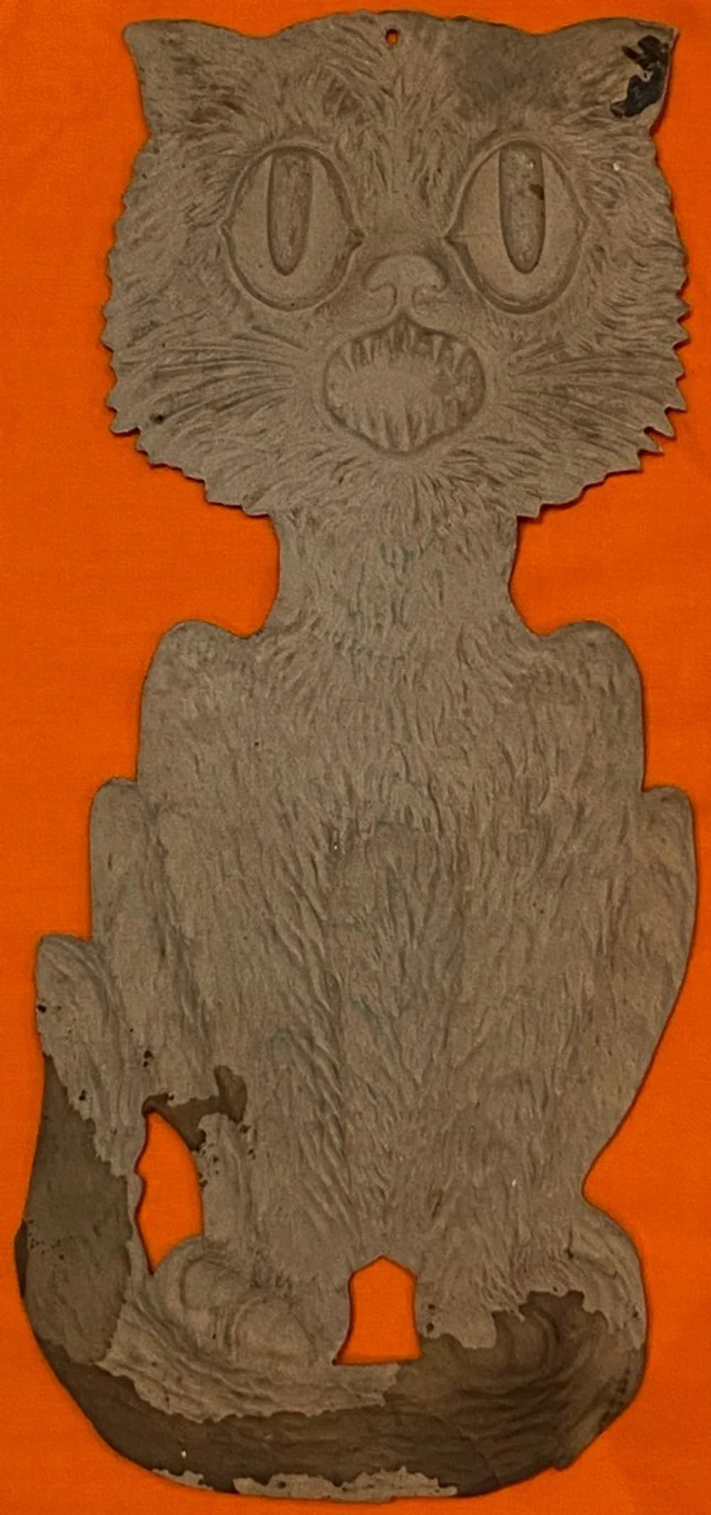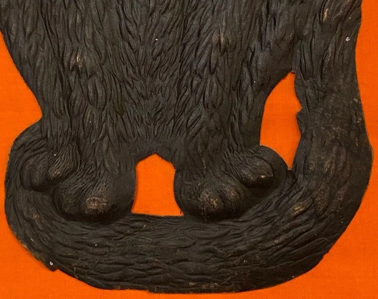This heavily embossed German diecut depicting a snarling seated black cat was produced in Germany during the 1920s and into the 1930s. It measures ~15.25” high by ~7” across. There is some staining to the reverse that doesn’t appear on the front. (Although the staining looks like the diecut was wet at one time, I find no other evidence of this.) There is a 1” closed separation at the bottom just to the right of the opening between the paws. Other than the hanging hole, there are no pinholes. These larger form factor German diecuts have become increasingly difficult to find for sale.