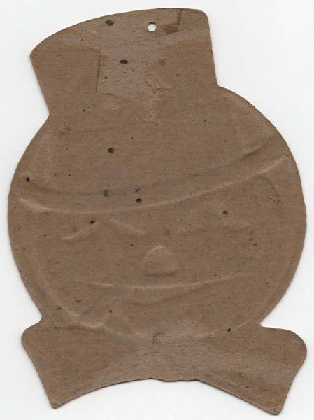 Beistle produced this lightly embossed diecut depicting a top-hatted JOL jauntily smoking a cigar during the early 1950s. It was one of a set of eight diecuts produced for just a season or two. (All of the set can be seen at the bottom of page 157.) It measures ~6” high by ~4.25” across. Other than the hanging hole, there are no pinholes.