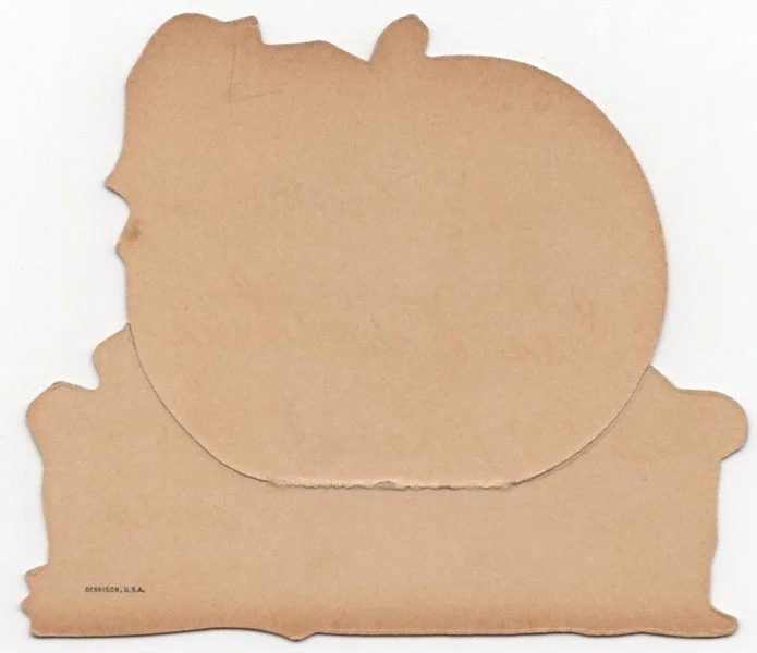 Dennison, not known for their product naming prowess, marketed this charming place card as simply “Pumpkin” when it first appeared in their 1924 Bogie Book. It was given a stock number of H29. What this really shows is a mischievous (and maybe regretful black cat) atop or clinging onto a large JOL. At the bottom is a witch’s hat and broom as if she has gone off somewhere leaving her clambering familiar meowing WTH. The card measures ~3.25” high by ~3.5” across. There is a name penned in old-timey printing.
