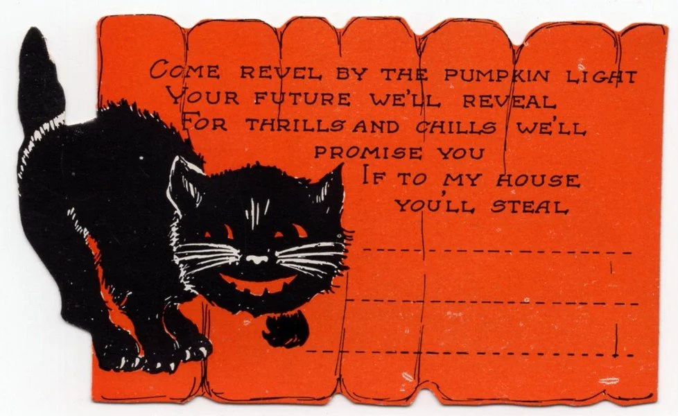 Whitney produced this invitation featuring a black cat sometime during the 1920s. It measures ~2. 5” high by ~4.25” across.