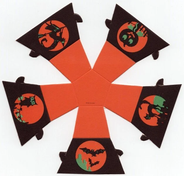 This nut cup was produced by a manufacturer unknown to me sometime during the later 1930s. It has never been folded. It measures ~6.25” across, unfolded.
