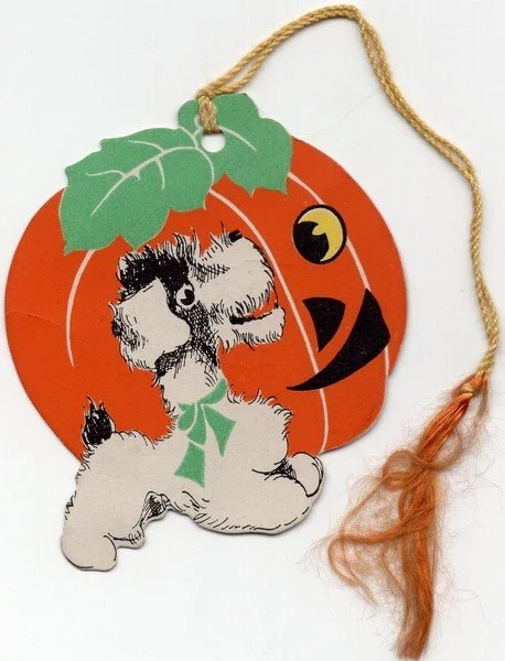 Gibson produced this tally card during the 1920s. It depicts a Scotty dog wearing a green ribbon collar and her friend, a JOL. The tally measures ~3.25” high by ~2.75” across.
