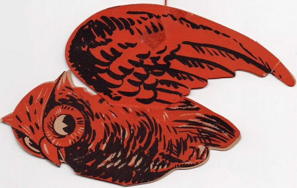 Gibson produced this 3-D flying owl during the early 1930s in two sizes. This is the smaller size, measuring ~4.5” high by ~7” across. It was designed to be hung from a ceiling and viewed from below, so the wings are decorated on the one side seen from below. The original hanging string is extant. Colors are strong. There is the remnant of a bit of tape on one wing with the end of that wing having a crease.