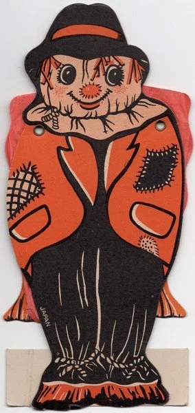 Beistle originated this design beginning in the mid-1950s and continuing for about a decade. Sometime toward the end of that run they apparently outsourced the design to manufacturers based in Japan. This is one of the items produced in Japan. This scarecrow measures ~8” high by ~3.5” across with the wings retracted. There is an easel.