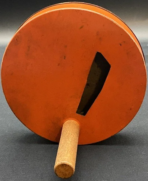 Chein produced this tin litho ratchet showing an outdoor party scene during the 1920s. It measures ~4” in diameter and has a wood handle. The tin lithography is in near-perfect condition. It makes plenty of noise!