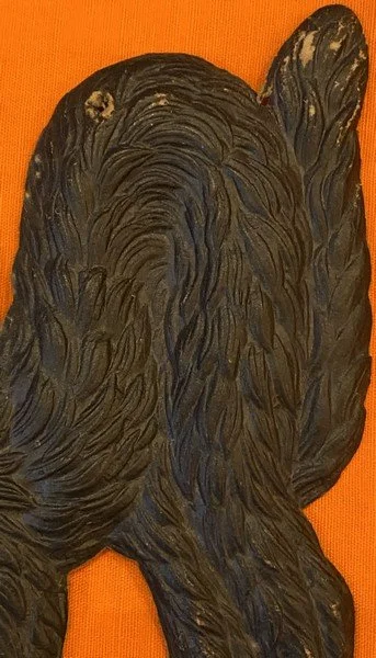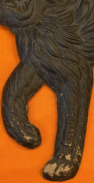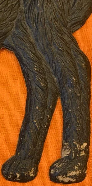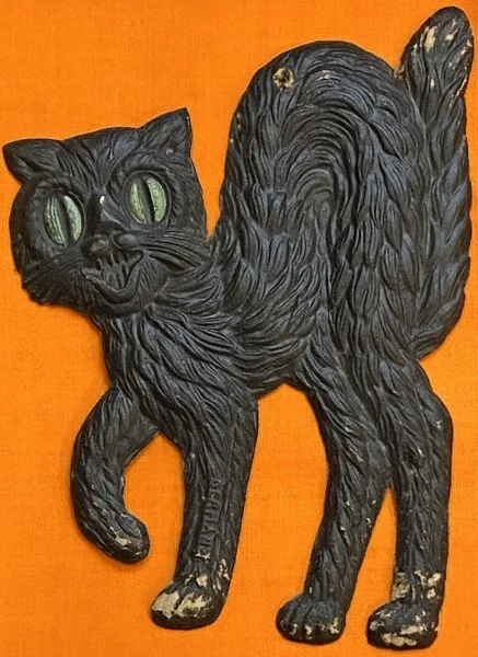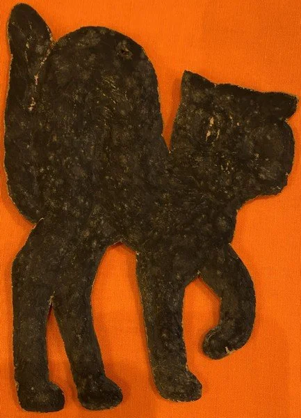 This arched-back black cat diecut was produced in Germany during the 1920s. It measures ~6.5” high by ~5.25” across. There is surface paper loss at the paws and toward the top of the tail.