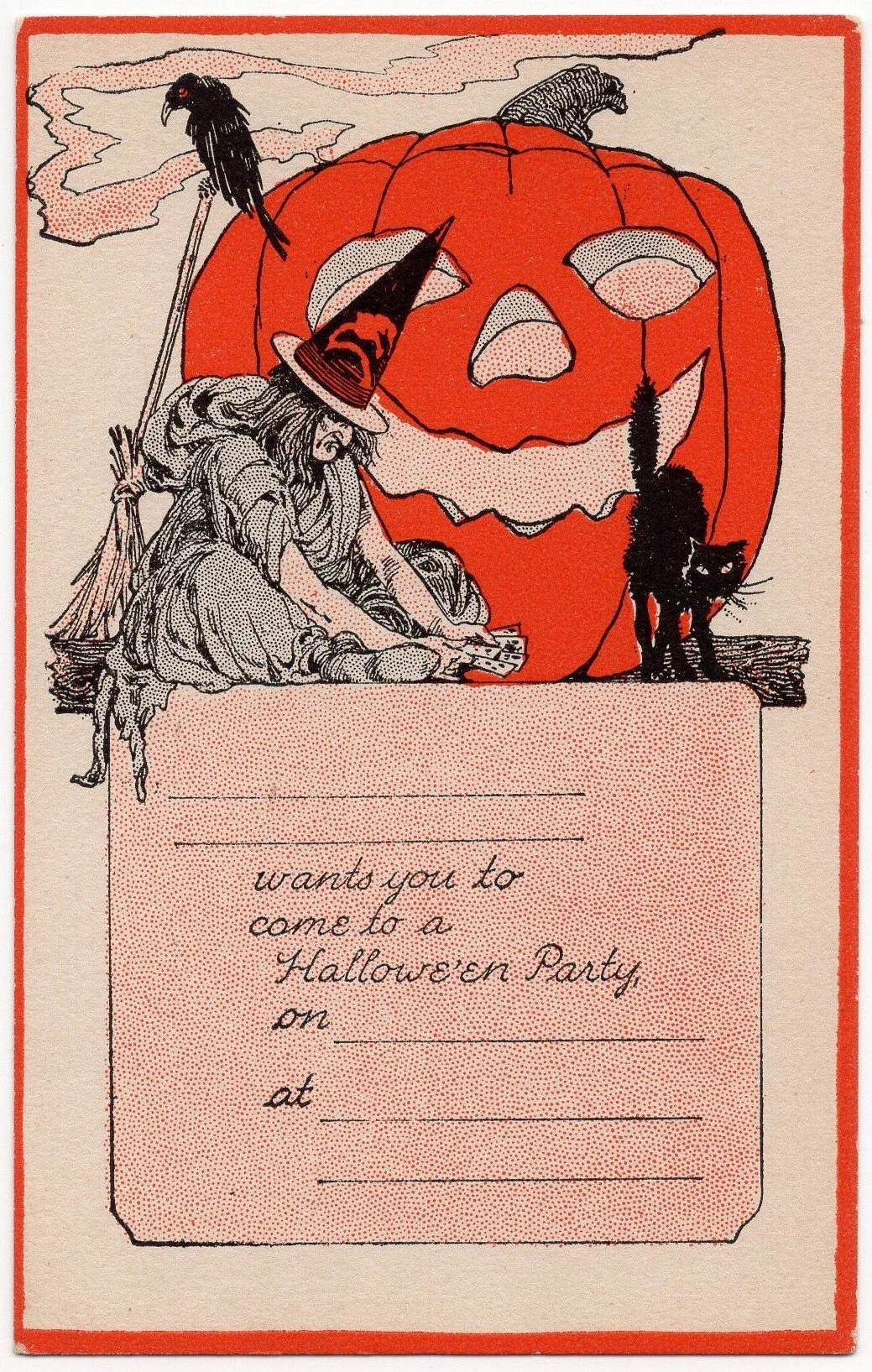 2602 1910s Unposted F A Owen Invitation Post Card with JOL, Witch and Black Cat