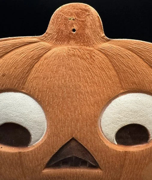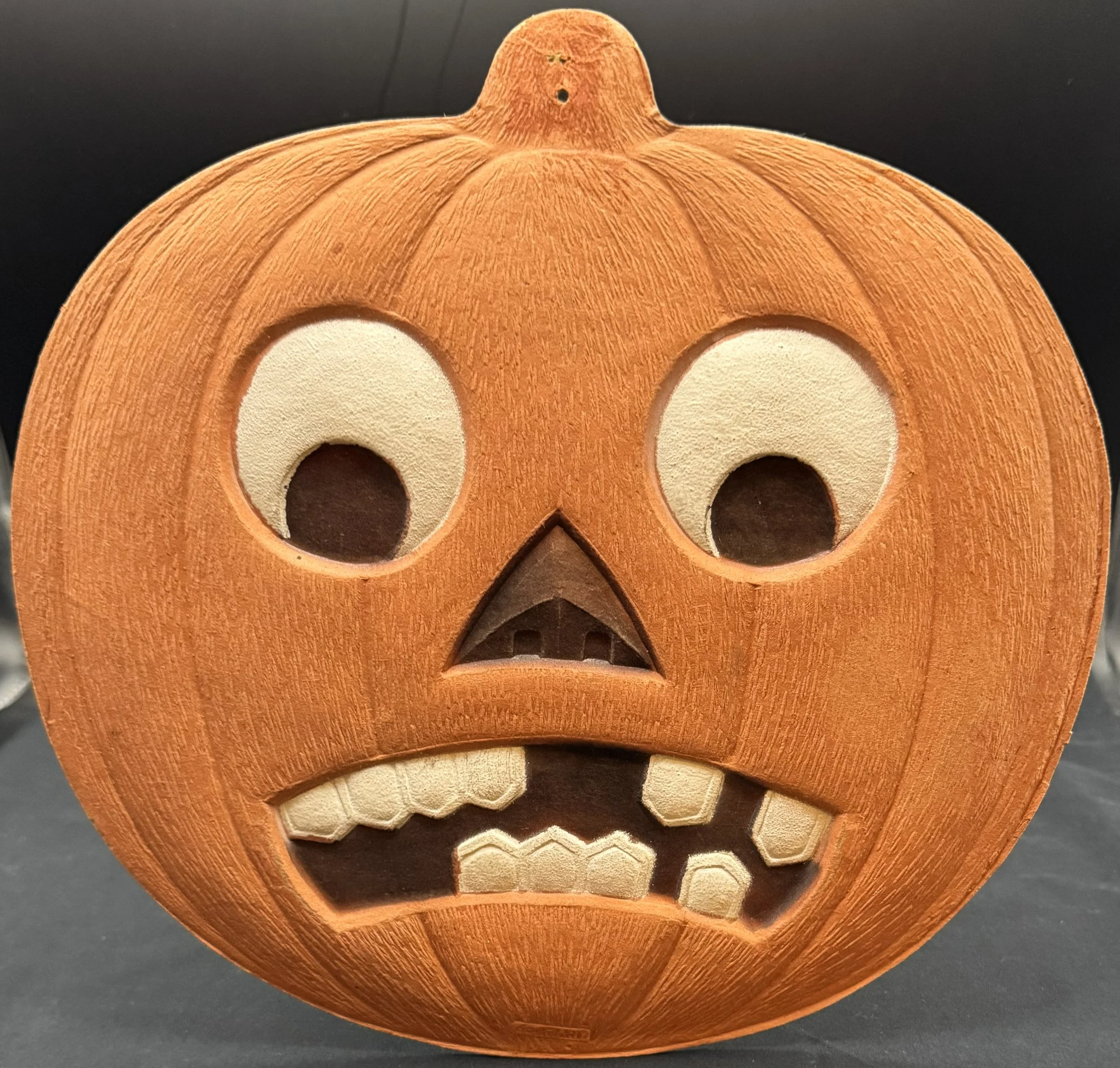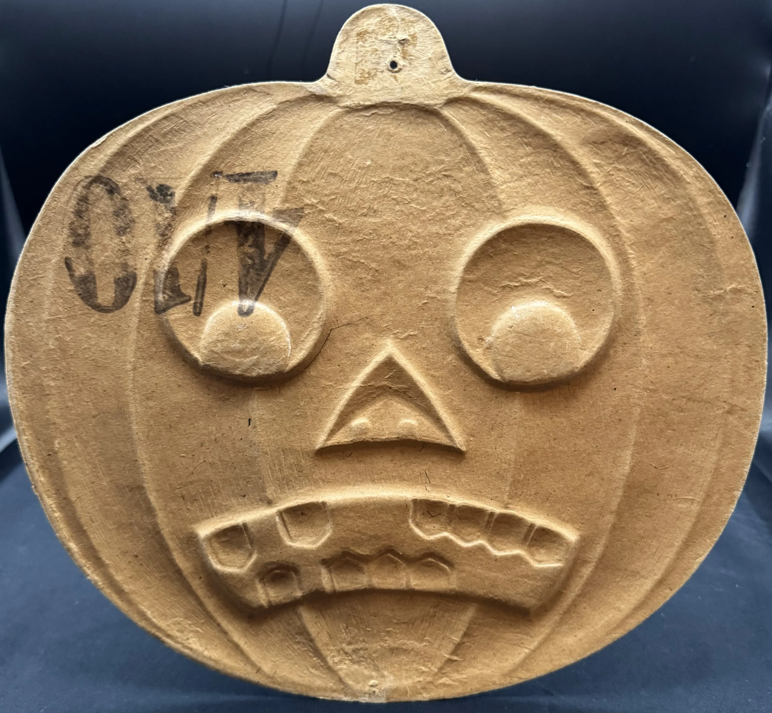 Those industrious Germans produced a head-spinning number of diecuts from their production zenith during the 1920s to the dwindling output through the first few years after WWII. This JOL diecut is arguably their most traditional design. This variant has ten teeth. It measures ~9.75” high by ~10.25” across. There is tape residue at the stem. The white highlights are near-perfect, which is unusual.