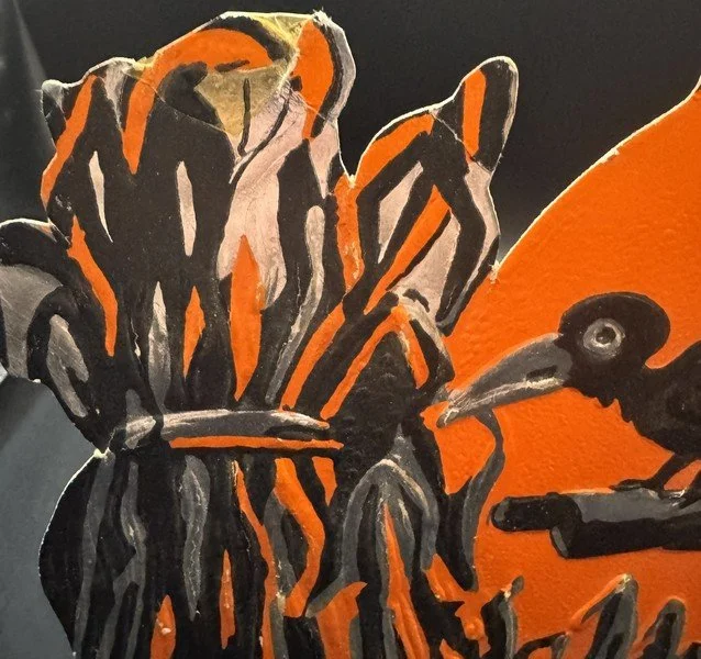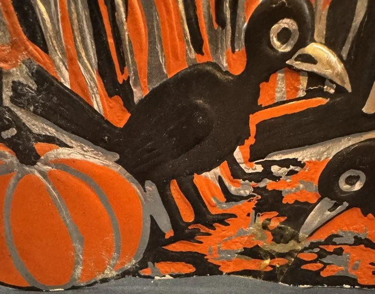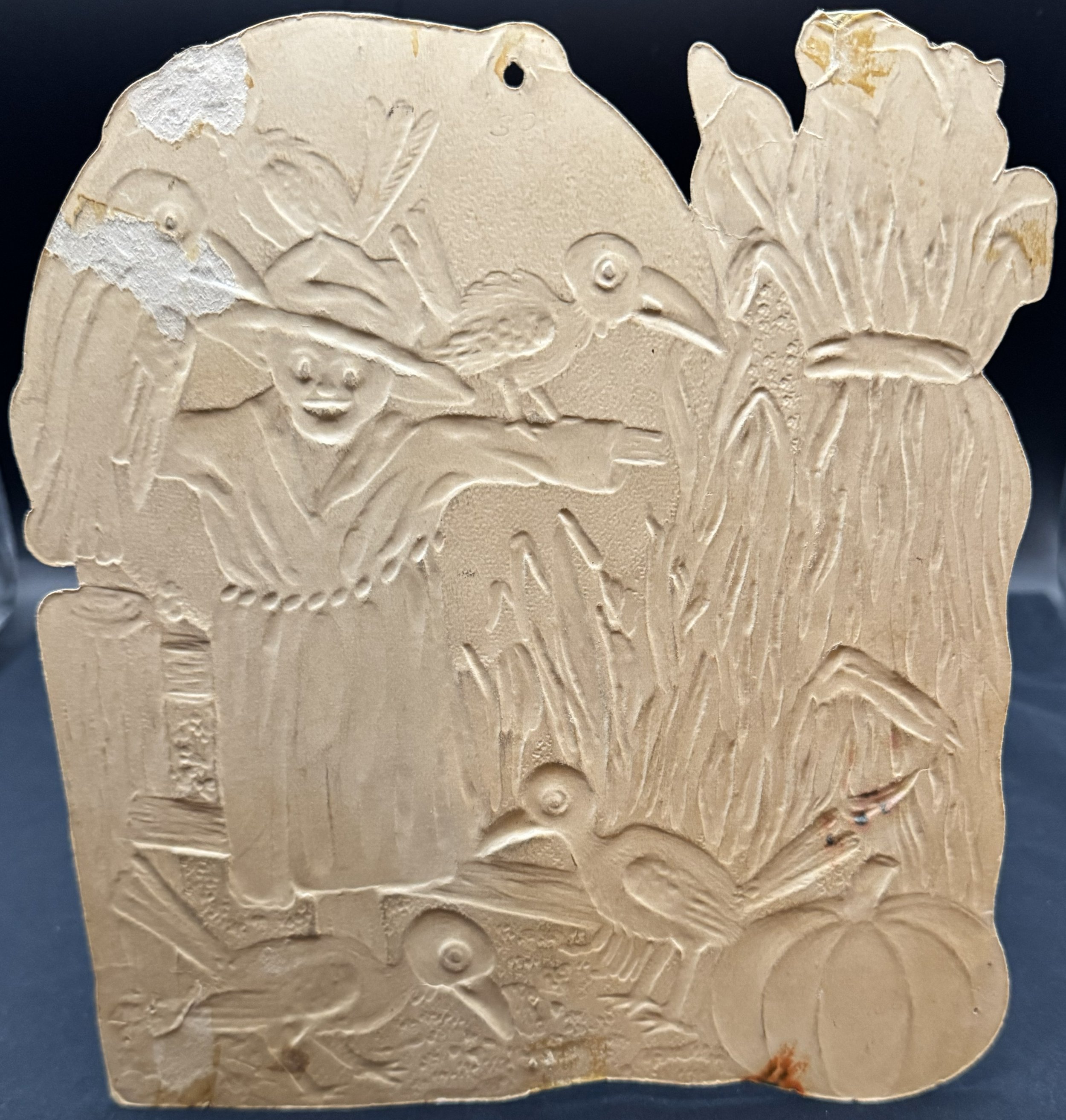 The complete set of twelve to which this diecut belongs was produced by Beistle from 1932 through the early 1950s. Beistle produced each in a silver finish for the first one or two seasons only. These silver-finished variants are difficult to find and have lighter embossing than their more common brethren pressed at the same time. (I don’t know why this is the case.) This diecut shows a scarecrow scene. It measures ~9.25” high by ~8.5” wide. There is light surface wear throughout, common to these variants. There is a bit of tape at the middle of the bottom right by the bird’s beak. It displays quite well, nevertheless.