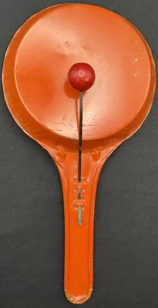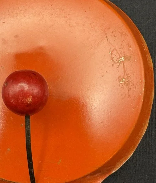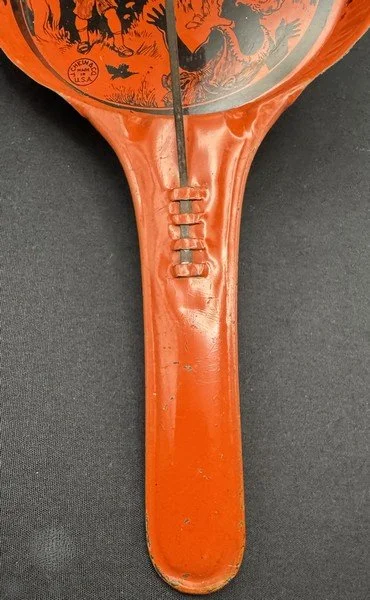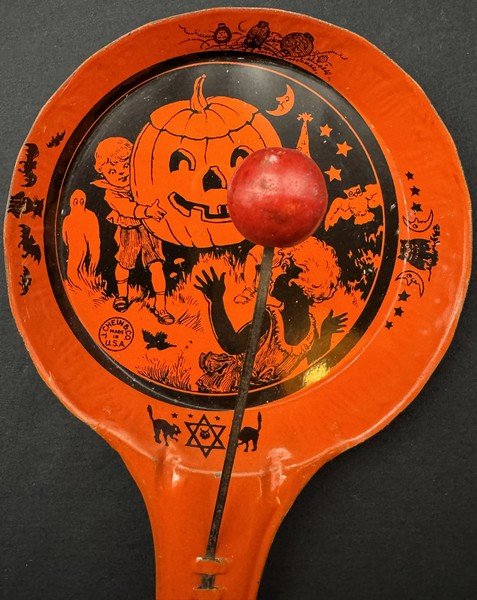 This tin litho pan clanger with an outdoor party scene was produced by Chein beginning in the later 1920s. Both wood spheres are original. The noisemaker measures ~8” high by ~4” in diameter. Except for some minor wear shown on the reverse, it is in remarkable condition. It makes plenty of noise.
