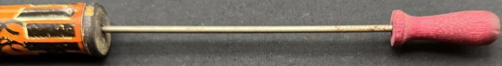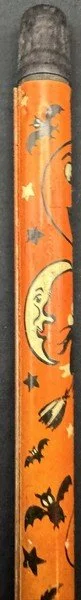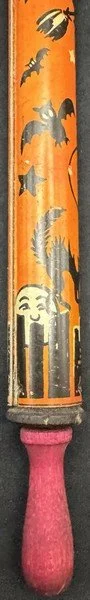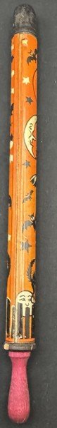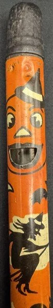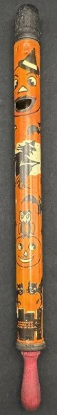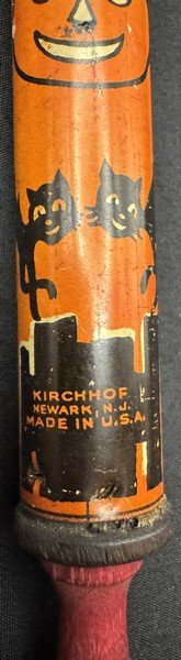 Kirchhof produced this tin litho slider for only a season or two. It is among the most difficult Kirchhof tin Halloween noisemakers to find. It measures ~10” long, with the slider closed. It still makes a satisfyingly variable sound when the slider is extended and retracted.