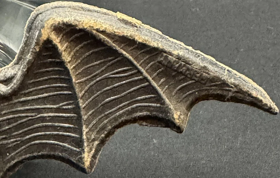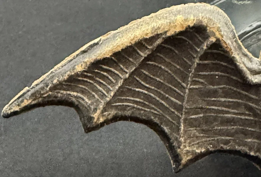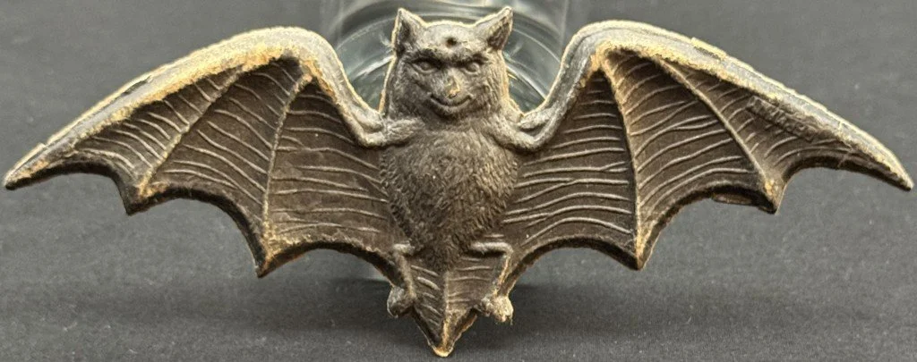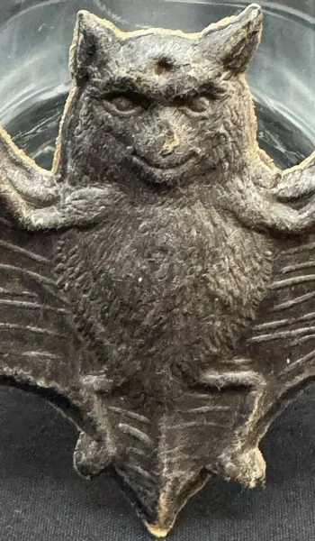 This heavily embossed bat diecut was produced in Germany during the 1920s. The level of detail from the wing structures to the furry abdomen is characteristic of the German’s fine work. The bat measures ~2.25” high by ~6” across.
