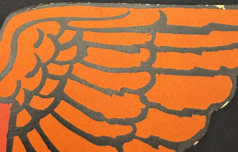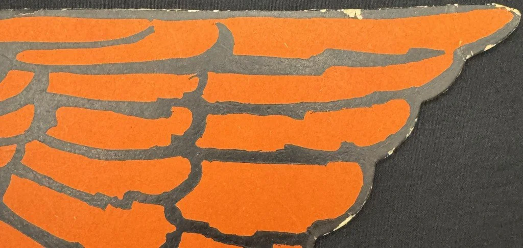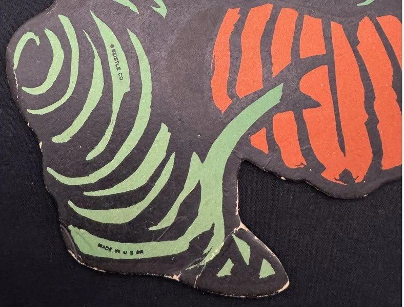 This party sign diecut first appeared in Beistle’s 1948 wholesale catalog. The diecut is on slightly thicker paper stock than many of their other products but is consistent with the stock used on others from the same set. The diecut measures ~11” high by ~11” across. The edge wear present on this diecut is common to those from this set. (It may have been due to whatever production process was used at the time.) There are two bends clearly shown in the photos. The colors are bright on this seldom-seen item.