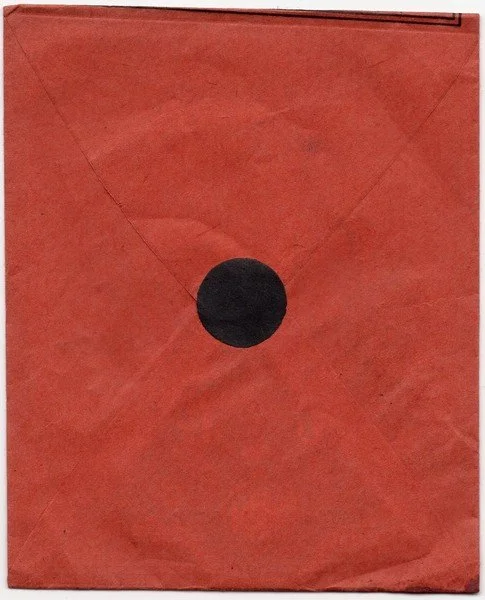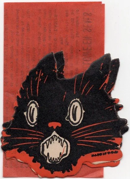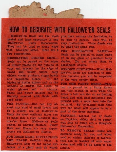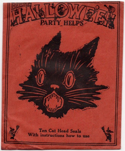 Beistle issued a panoply of enveloped sets of seals, cut-outs, invitations, candy trays, etc., mostly in envelopes designated with their “Party Helps” line. The earlier iterations tend to only have the word Halloween in caps and festooned with a vines and JOL motif. This envelope of “Ten Cat Head Seals” is one of the latter. The envelope looks so good that it’s hard to remember that it is ~100 years old! The contents are complete, but the seals have clumped and adhered to the instructions. The envelope measures ~5” high by ~4” across.