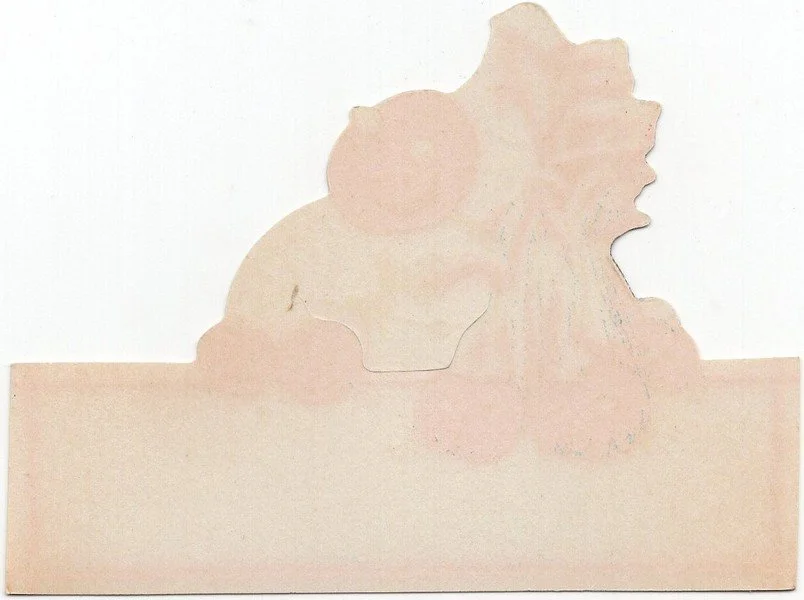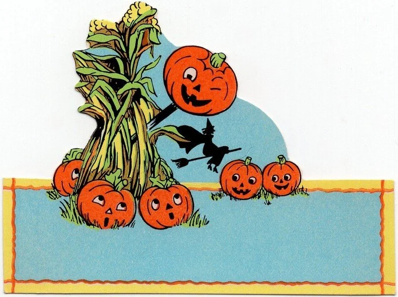 This unused place card was produced during the 1920s by a small regional firm out of Boston, McKenzie Greetings – Messengers of Sunshine. These were designed to be placed on the edge of a drinking glass to denote a guest’s place at the table. These were sold in packs of eight for one thin dime. It measures ~2.75” high by ~3.5” across. Blue is a color not often seen used so prominently with Halloween small paper. I think it makes the piece really pop.