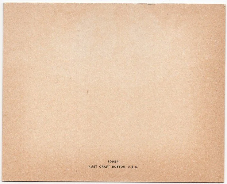 Rust Craft of Boston, Massachusetts, produced this To Wish You A Happy Hallowe’en card during the 1920s. The perched owl looks a little askance at the dancing and frivolity! Rust Craft produced exquisite small paper items. Collectors began snapping up their output in earnest about five years ago. This card measures ~4” high by ~4.75” across. The colors are bright as the card seems brand new.