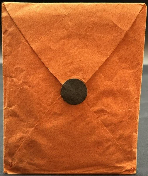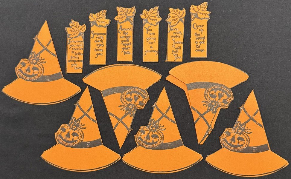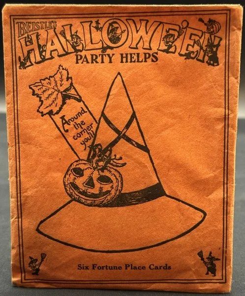One of the more charming Beistle enveloped products was their Fortune Place Cards. An earlier version contained only five place cards, but they were of a significantly larger form factor. I think Beistle rightly decided they were too big, so scaled them down to the size of this set. This set is unused and was previously never even removed from the envelope. To photograph the contents, I gently unsealed the back flap. The thin-tissue envelope measures ~5” high by ~4” across. The witches’ hats measure ~3.25” high by ~3” across.