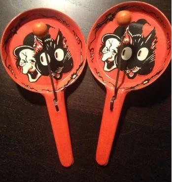 I just made an offer through Ebay for these two noisemakers, sending the following message along to the deluded seller with the offer: Your pricing has elicited many laughs throughout the collecting community. On what, pray tell, are you basing these ridiculous asking prices? My offer was for $60.00 and it received an auto-reject. I find sellers like this one annoying. This particular seller has listed quite a few lots of vintage Halloween items with the same pie-in-the-sky pricing wholly unconnected to any semblance of reality or condition. This is another example of how Ebay has devolved into more of a junk store.