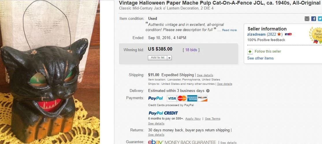 I just had a conversation with two close friends who visited today regarding the many crazy, unsustainable prices being seen lately for otherwise ordinary vintage Halloween items. The tulip mania or bubble of the 1600s was mentioned. Are we in a bubble phase wherein unremarkable and imperfect items are bid to - let me say it - ridiculous levels that I feel are unhealthy for the overall hobby? This pulp lantern is so common that nary a week goes by that you can't have your choice of several. The typical trading range is around the $150 level. Why would this go for $385? Now, I am happy for the seller who assuredly cannot believe her good fortune, but the buyer will almost certainly never again see this price when, and if, they ever decide to sell.