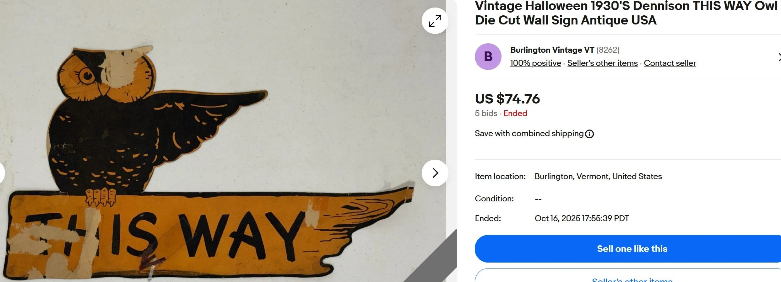 Vintage Halloween 1930'S Dennison THIS WAY Owl Die Cut Wall Sign Antique USA October 17, 2025 I wonder why people would bid this up to $74.76 given its condition?
