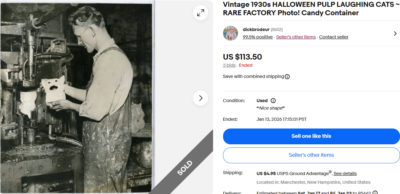 Vintage 1930s HALLOWEEN PULP LAUGHING CATS ~ RARE FACTORY Photo! Candy Container January 14, 2026 This fascinating listing shed light on how some pulp cat lanterns were produced. I never pictured them in my mind as being created upside-down. Halloween-related vintage photographs have done well over the last few years.
