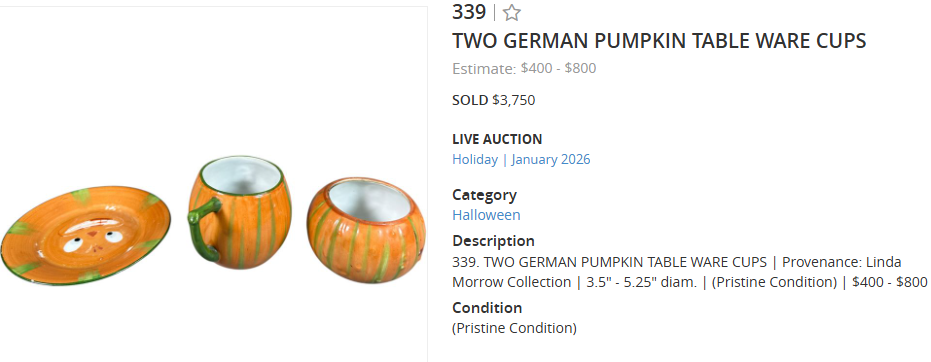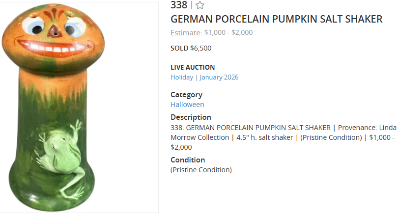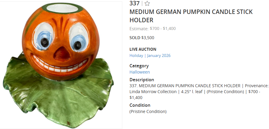 Candy containers saw strong results as did hard plastic and German porcelain. I’ve included the lots I found notable below.