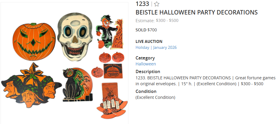 Over the last two days Bertoia Auctions held their Holiday January 2026 event, with a very nice selection of vintage Halloween. Although they had very few diecut lots, one held an exceedingly rare Dennison item that I was lucky enough to snap up for a good price. (Now, keep in mind like all auction houses there is a buyer’s premium. In this auction it was 20%. One of the buyer advantages to my auction is that I have never charged a buyer’s premium, only requiring a book purchase for entry eligibility. My auction’s publicity will start in about a week. The preview period will begin February 18.)