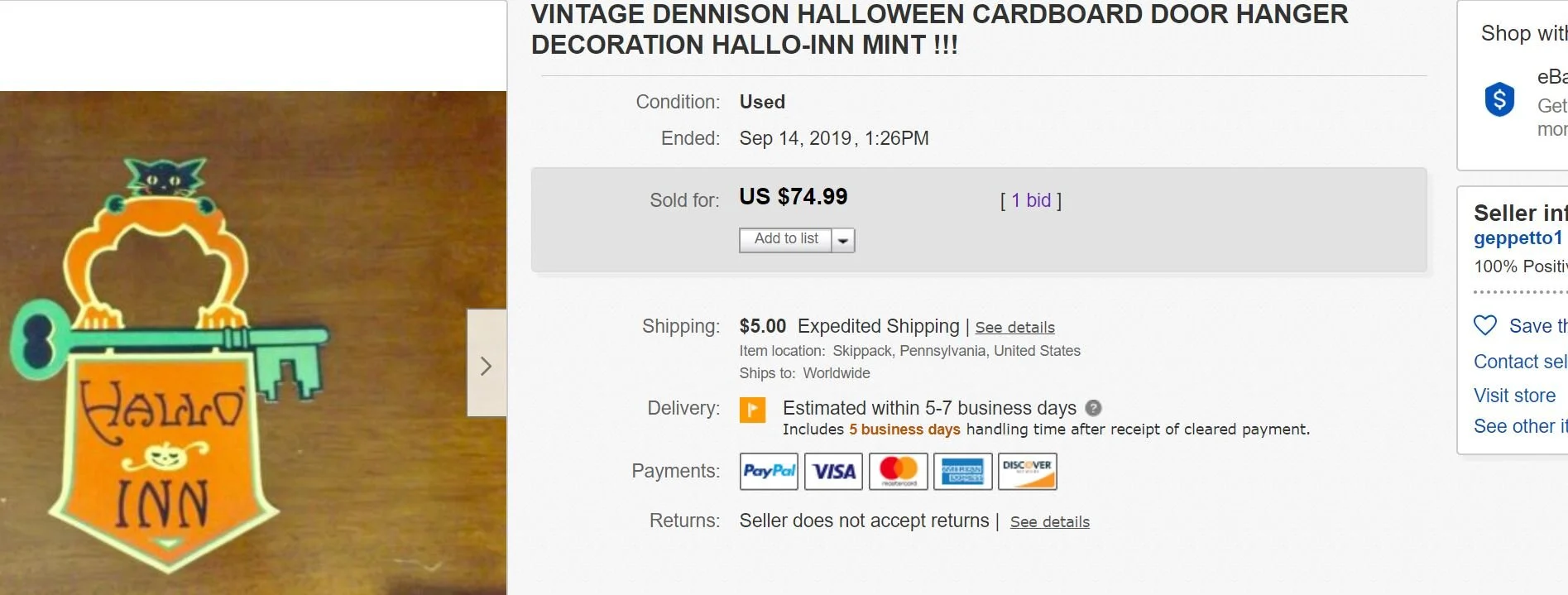 The crop this season of rare vintage items has been smaller overall than in many years past, so it is nice to see such a coveted and elusive diecut surface. As with many firms, Dennison was hard hit by the Great Depression. Their overall output was significantly lessened by the time this wonderful item was produced from 1930-1932. Not many were made and not many have survived the long journey through time. I know of VERY few collectors that own one of these. I do not. I struggle with whether to buy rare items with condition issue, and this falls in the "what should I do" zone. The SGV is $325, but since one of these hasn't surfaced in any venue I know of for nearly a decade, the sky's the limit.