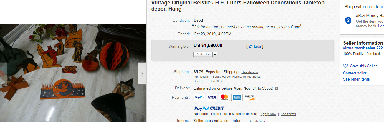 There are so many wonderful things in this lot that the seller did themselves a real disservice by lumping everything together. The table top Beistle witch with the black honeycomb skirt is exceedingly rare. I think this may be only the second time I’ve seen one. In my opinion, that alone would have gotten close to the ending price for the lot if it had been offered separately.