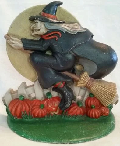 WICKED WITCH ON BROOM DOORSTOP Cast Iron Pumpkins Halloween Vintage