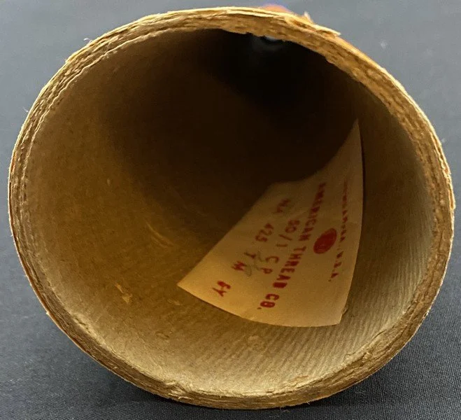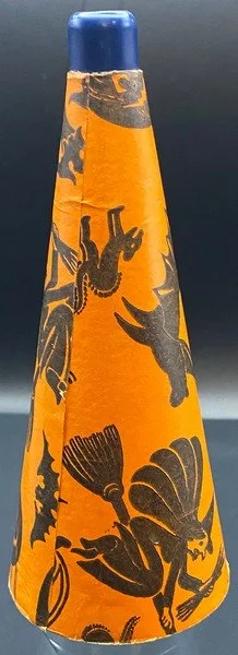 Bugle Toy produced this lithoed-paper-over-cardboard horn during the early 1930s. It stands ~6.5” high. The blue mouthpiece no longer produces sound. The colors are bright and bold. Many of these horns began life as a spindle in a textile factory. Before being converted into a great Halloween horn, it lived at the American Thread Company in Newnan, Georgia, as evidenced by the label inside the horn. This is the very item photographed for my reference book, appearing on page 209 of the third edition. This entered the collection on September 4, 2008. The buyer will receive a handwritten note on my personal Halloween stationery attesting to this provenance.