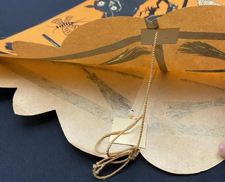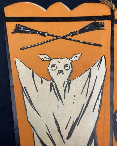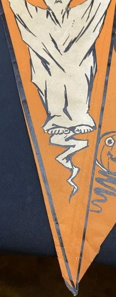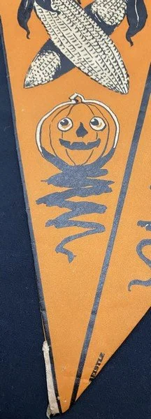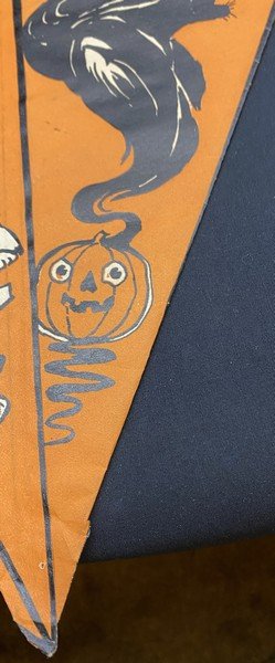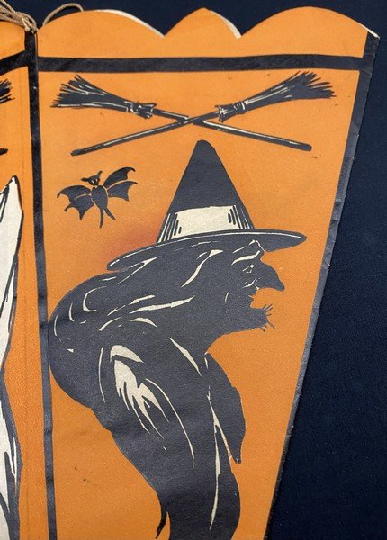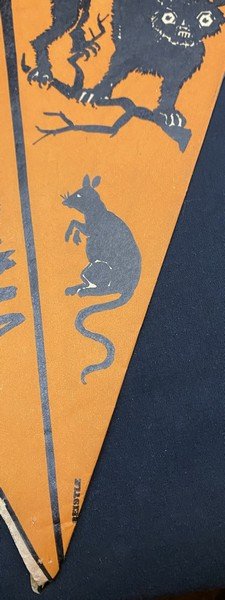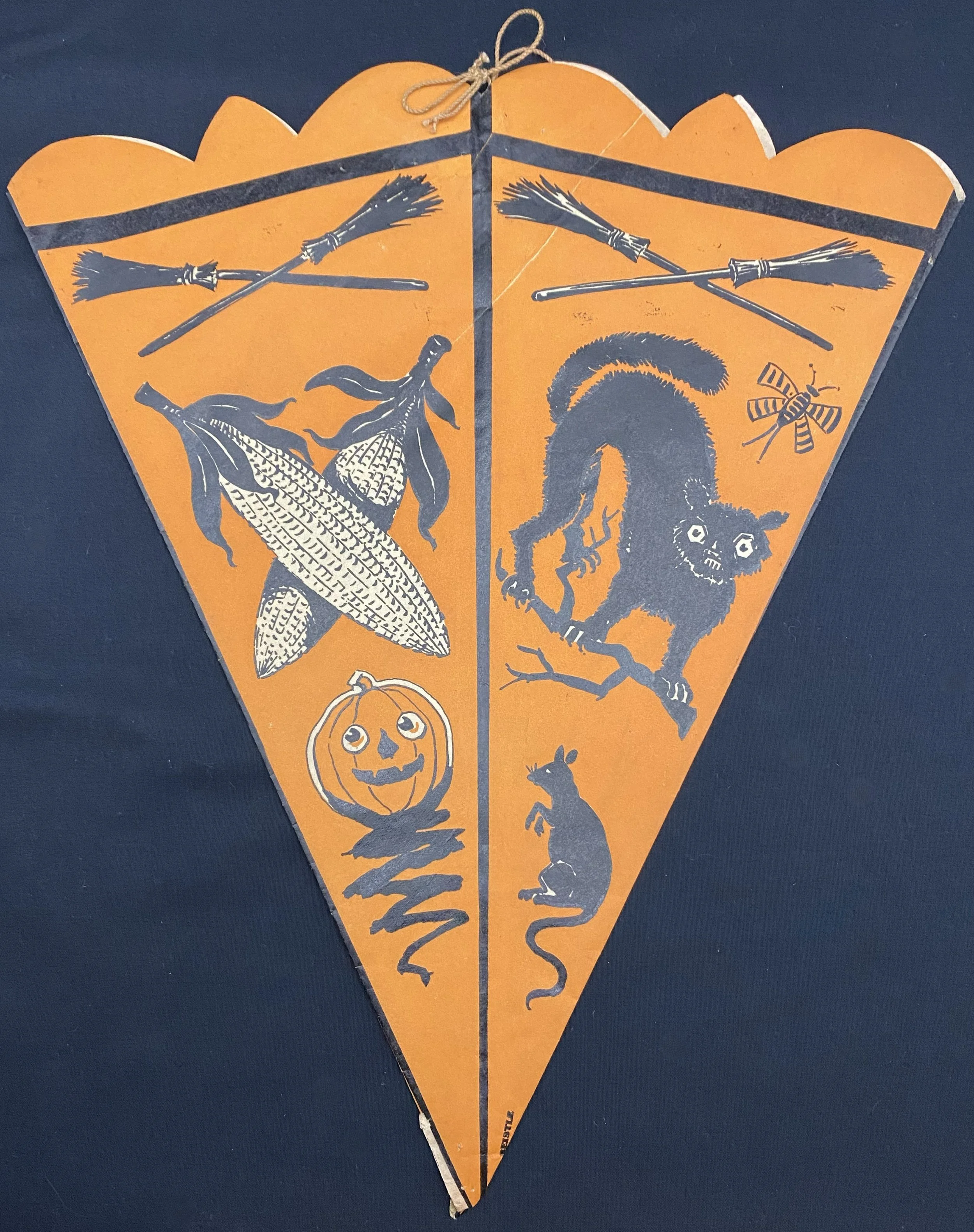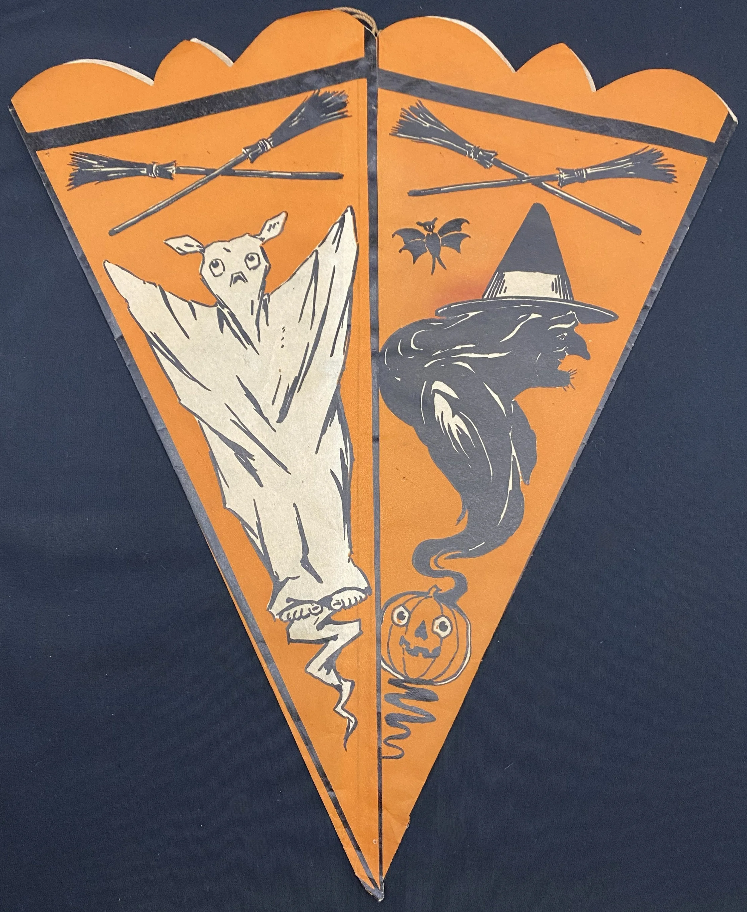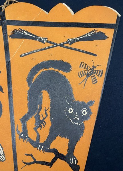 When I first saw this pennant when cataloging a collection I purchased, I thought it was a hat. It isn’t. This is a truly early party decoration that Beistle produced featuring what we know now as their early iconography: crossed brooms, the ghost with top knots and bare feet, a vaporous witch, ears of corn, a JOL, a rat, a scared cat and a weird, striped bug. Even my early Beistle catalogs don’t show this pennant. I suspect this was made for a single season. There is a length of string attached to either side of the pennant’s top interior. The pennant is made from a thin paper stock. There is one pinhole at the bottom of the pennant. There are no tears! The pennant measures ~13.5” high by ~11.5” across. Prior to its acquisition, I had never seen it before. I suspect that few exist.