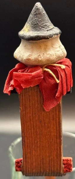 This wood ratchet was produced in Germany during the 1920s. It features a composition witch head surrounded by red crepe. The composition is highly detailed. The wood arms and legs of the witch attach to the main part of the ratchet with strong wire. The ratchet makes plenty of noise. It measures ~8” high by ~4.25” across by ~1.5” deep.
