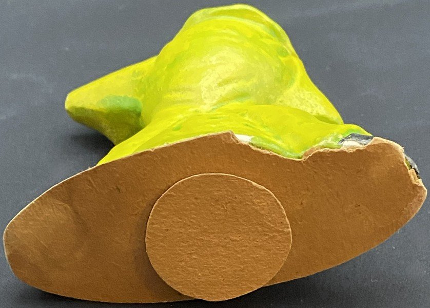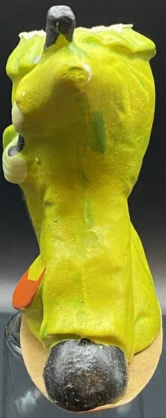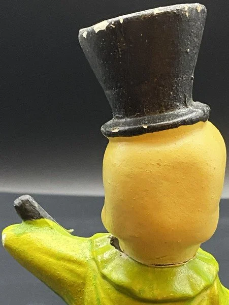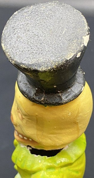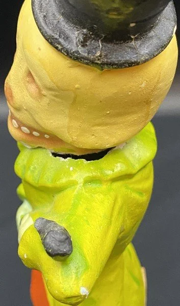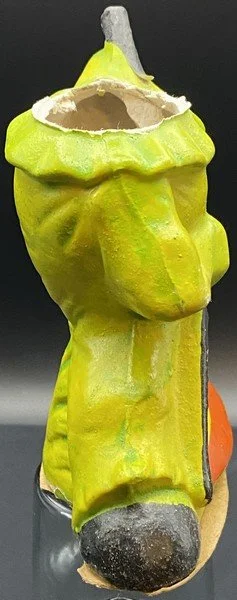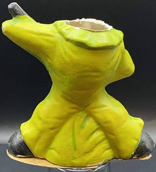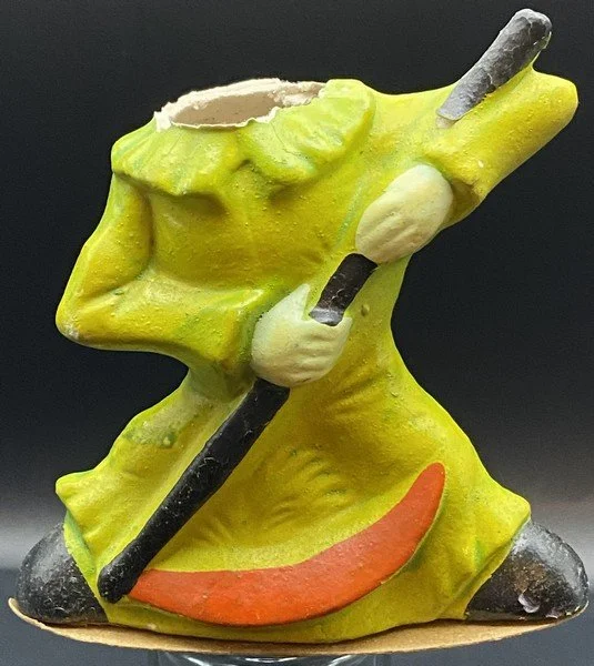 This composition candy container was made in Germany during the 1930s. Sadly, the head was separated from the body while in transit. (Thanks, UPS!) Someone skilled in the restorative arts should be able to mend this. The ghoul with scythe imagery is unusual. Intact, this is a sizable container. It measures ~7.25” high by ~4.5” across. It opens from the bottom.