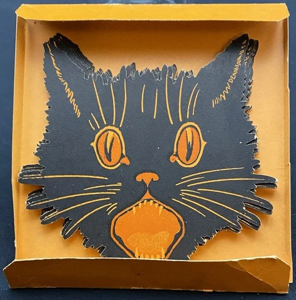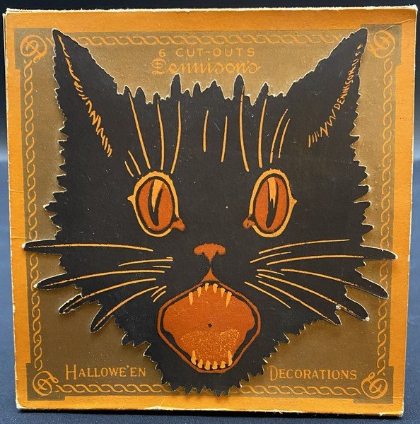 Dennison first issued this slide box of six cat face cut-outs in 1924 with a stock number of H98. The box measures ~4” square. The complete contents are extant. All but one have a name written on the reverse. This is the very item photographed for my reference book, appearing on page 244 of the third edition. This entered the collection on August 2, 2007. The buyer will receive a handwritten note on my personal Halloween stationery attesting to this provenance.