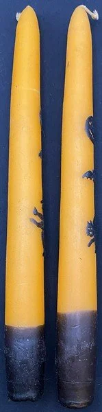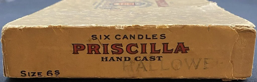 This exceedingly rare box with two of its original six Priscilla candles intact was produced by the Standard Oil Company of New York, shortened to Socony, during the early 1920s. The box is stamped on one short end with the word, Halloween. The two extant long tapers measure ~10” high. Three iconic images in black appear on each candle, with the bottom image on one a broomed witch while the other is an arched-back black cat. The candles are unused. One long side of the box lid is partially intact. Three corners are split. The box bottom has one split corner. Prior to its acquisition I had never seen these before. The box, in fair to good condition, is a treasure.