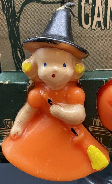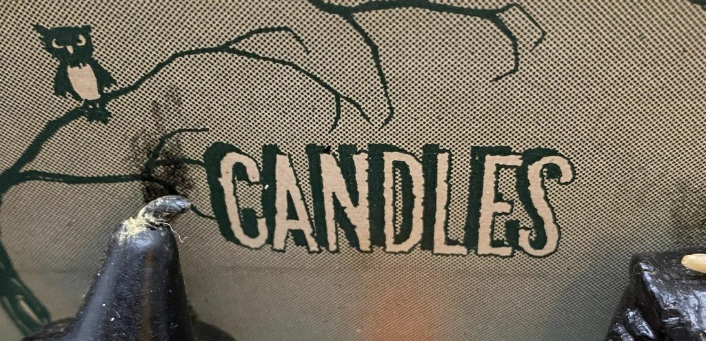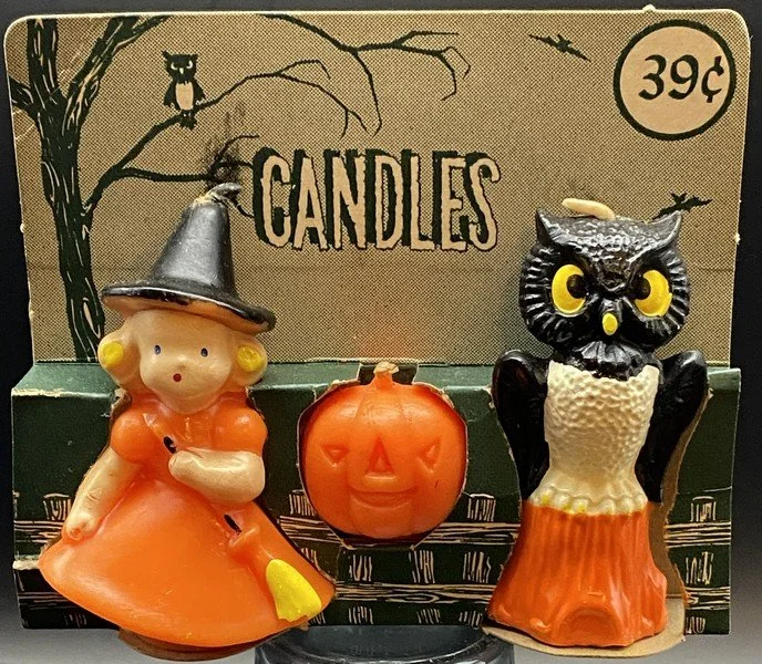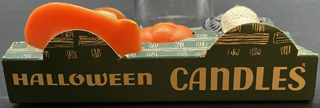 Gurley of Buffalo, New York, produced this package of three candles during the 1950s. This was a true variety pack consisting of a young witch, a JOL and a perched owl. The package measures ~4.25” high by ~5” across by ~1.75” deep. The candles are unused and in near-perfect condition. There is some color transfer from the black of the flanking candles to the decorative top of the packaging. The cardboard enclosure on the witch side has split but rests cleanly together. It is getting hard to find complete packages of vintage Gurley candles with original contents.