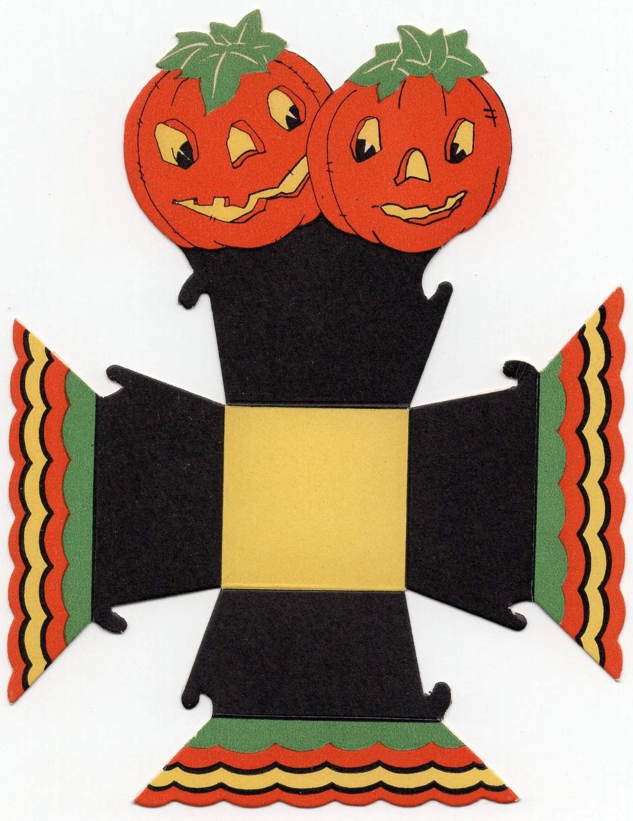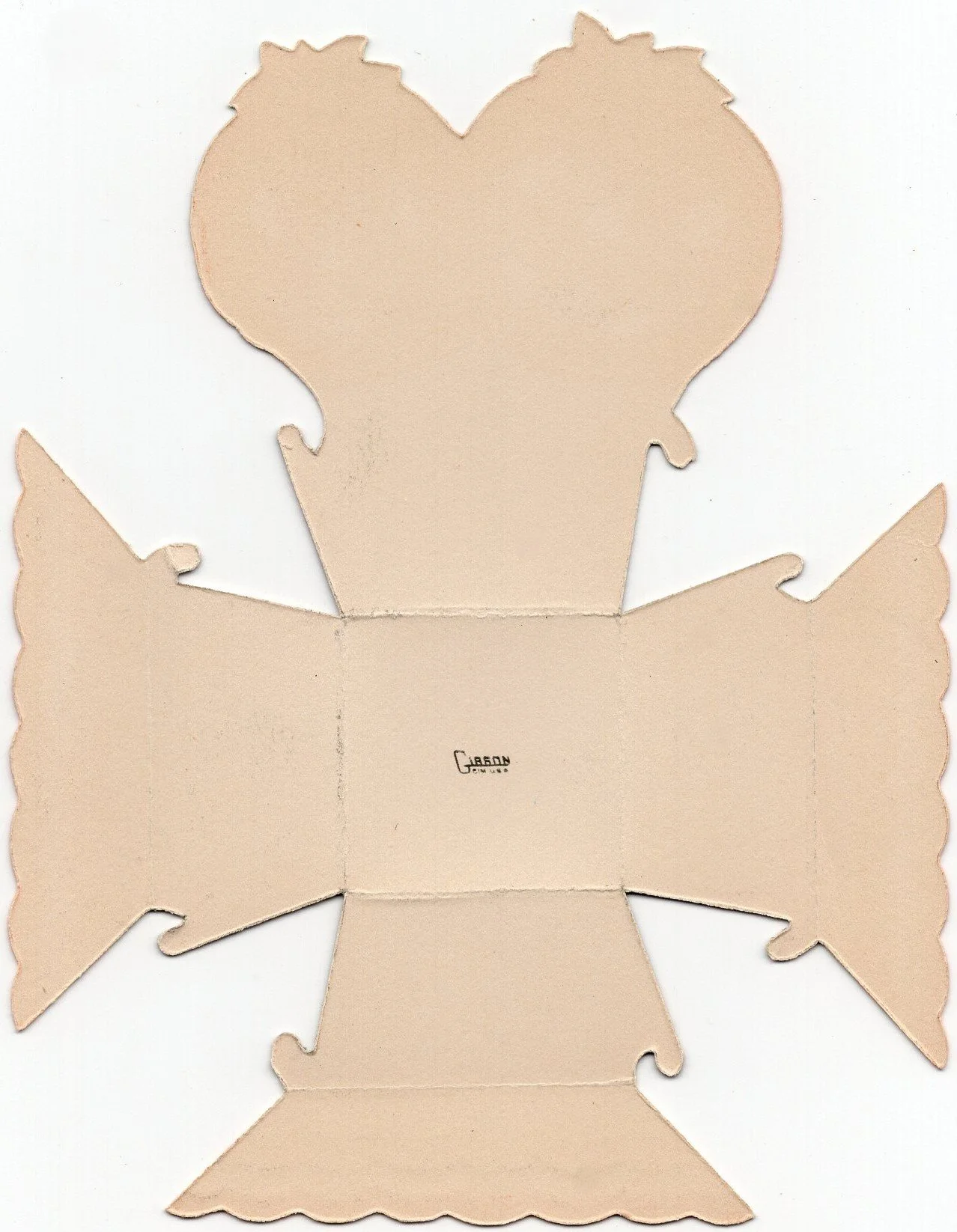 This nut cup was produced by Gibson during the 1920s. It measures ~5.5” high by ~4.25” across, unfolded. It has never been folded. Prior to its acquisition, I had never seen it before.