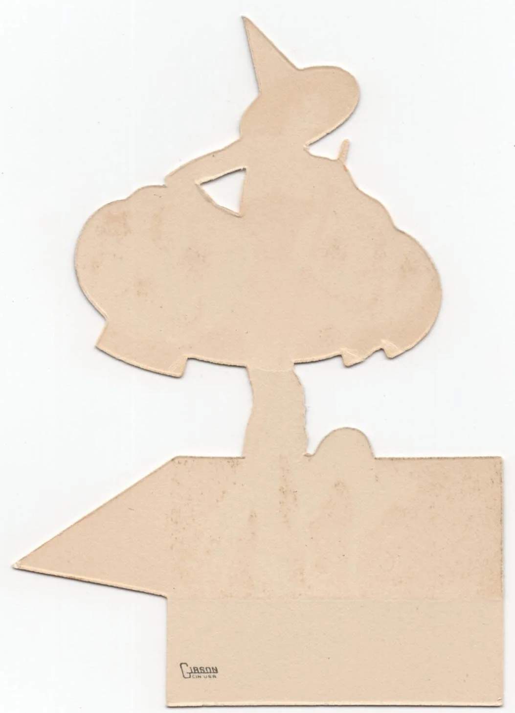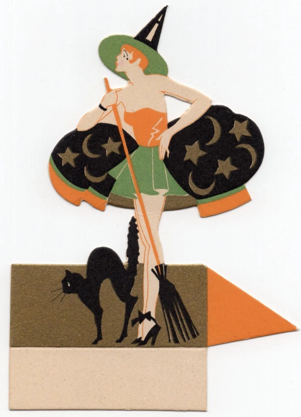 Gibson produced this place card during the 1920s. It shows an elegant lady witch in a voluminous skirt with her familiar standing guard as she contemplates whether to take a spin on her new broom. It measures ~4.75” high by ~3.5” across. There is only a cosmetic bend right below where the legs meet the skirt. It doesn’t affect the integrity of the card. In other words, no floppiness!