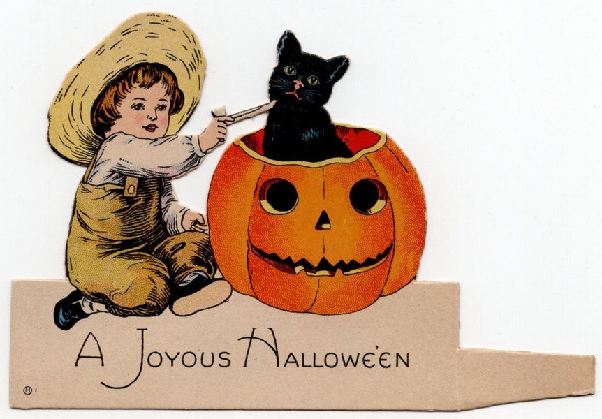 Hallmark produced this place card with a printed sentiment during the 1920s. It measures ~3.25” high by ~5” across. Hallmark excelled at the use of subtle coloration, exemplified nicely by this item. The cat’s expression at being offered the pipe is sublime. I can almost hear the thought: What sins have I wrought to deserve this?