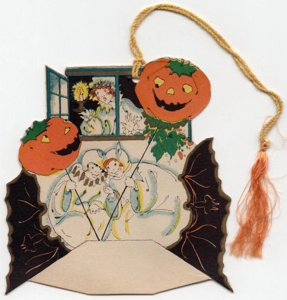 Over the last three years or so, two producers of vintage Halloween small paper have come into their own with collectors. Dennison, Gibson and to a lesser extent, Beistle, have uneasily shared the small paper throne for many years, but as of late challengers like Hallmark and Rust Craft have emerged. Although none of these mentioned can compete with the sheer breadth and depth of Dennison product lines, the latter two can easily compete on the grounds of artistic creativity and sheer bravado. I have become a huge fan of both Hallmark and Rust Craft, eagerly sniffing them out like a truffle hunter. This tally shows a pair of dressed children hiding under a window holding their JOL parade lanterns. I appreciate the flanking bat and the querulous expression on the dowager’s face. The tally measures ~3.5” high by ~3.5” across. Its stock number is 3H2.