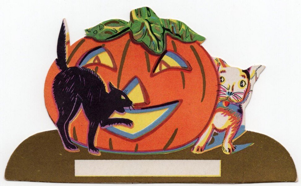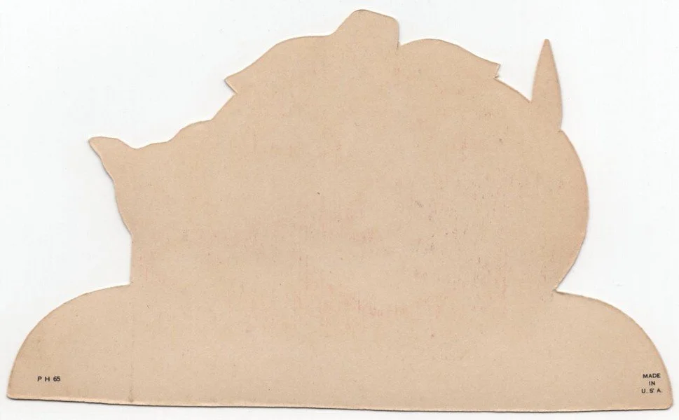 This place card was produced by a firm unknown to me during the early 1930s. It depicts a jolly JOL happy to see its friends - an arched-back black cat and a cowed dog. The art has a Deco feel to it. The colors are bright. It measures ~3.5” high by ~5” across. There is a stock number of PH65 on the reverse.