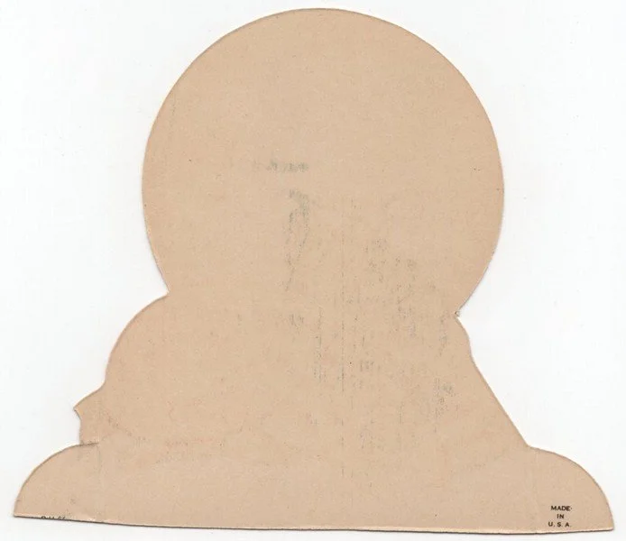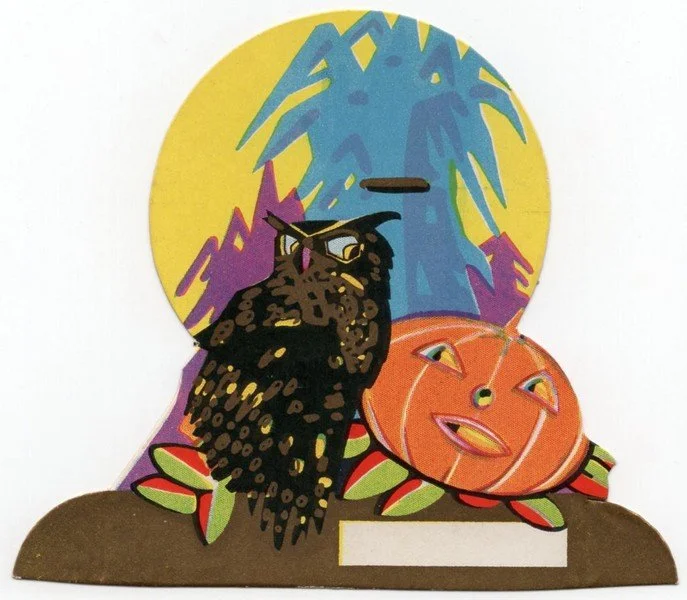 This place card was produced by a firm unknown to me during the early 1930s. It depicts a JOL, owl and corn shock against a full moon. The art has a Deco feel to it. The colors are bright. It measures ~4” high by ~4.75” across. There is a mostly obscured stock number of PH64 on the reverse.