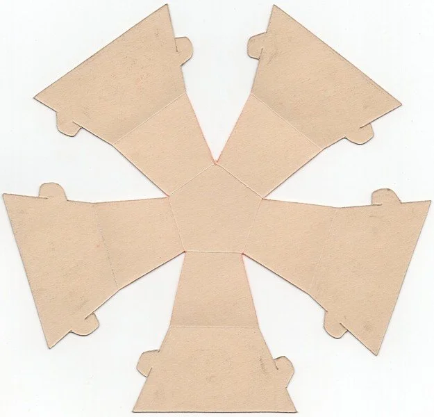 This nut cup was produced by a manufacturer unknown to me sometime during the late 1930s. It may have been folded at one time, although the tabs show no evidence of this. It measures ~6.25” across, unfolded.