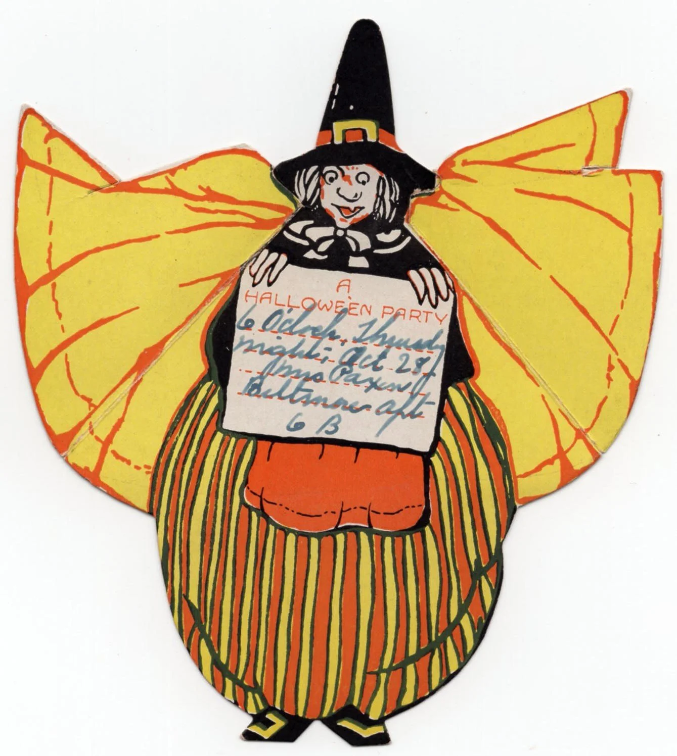 Whitney produced this unusual witch invitation during the late 1920s. Based on the note written inside, the event at the Biltmore Apartments was held in 1927. The invite measures ~5” high by ~3.5” across, closed. Prior to its acquisition, I had never seen this item before.