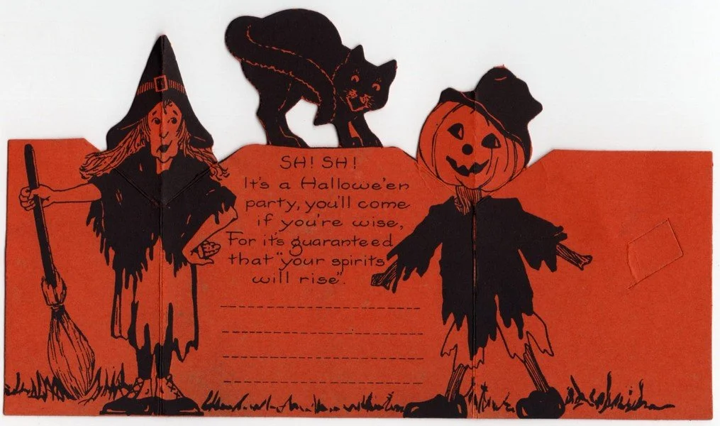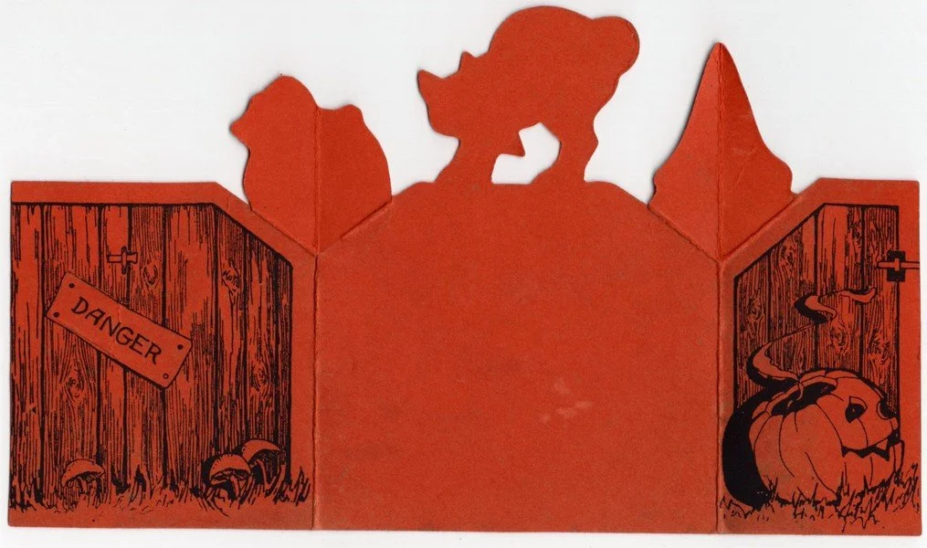 Whitney produced this deluxe pop-up invitation during the 1920s. These were expensive items back then, accounting for why collectors don’t see such items often available today. When they are seen, they are almost always used. This is one of the rare unused examples. The art is incredible. Just look at the wood grain detail of that gate with a JOL on one side and mushrooms on the other. The interior imagery is fun, too. This measures ~4.75” high by ~3.5” across, closed. There is some toning to places along the bottom.