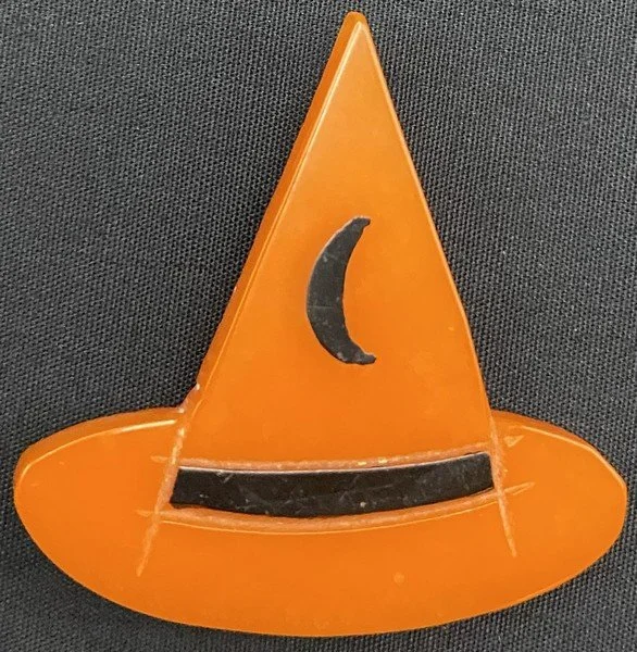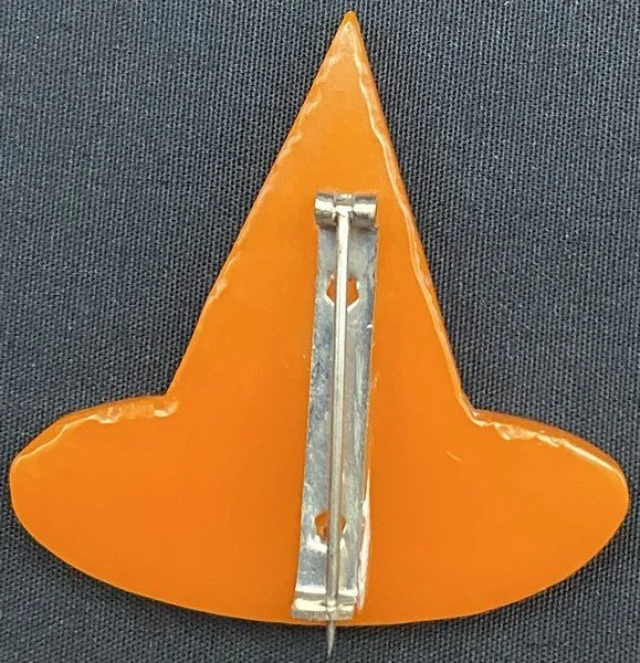This Bakelite pin in the form of a witch’s hat was produced during the 1930s by a manufacturer unknown to me. The pin measures ~1.75” high by ~1.75” across.