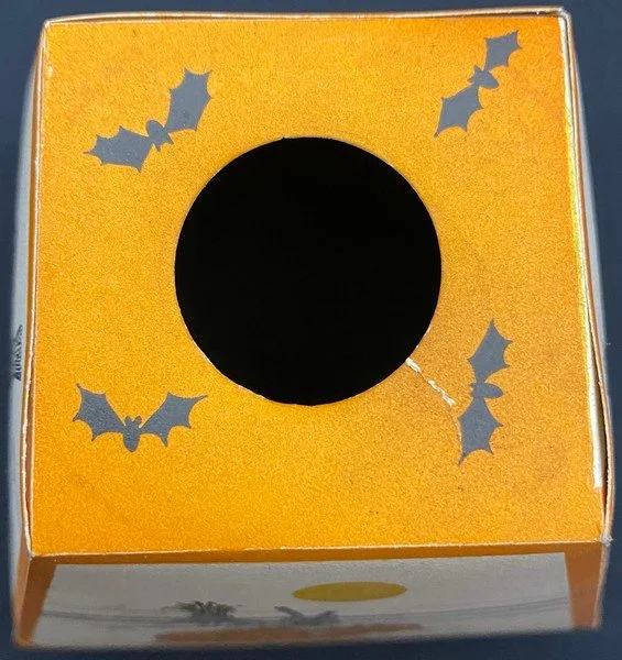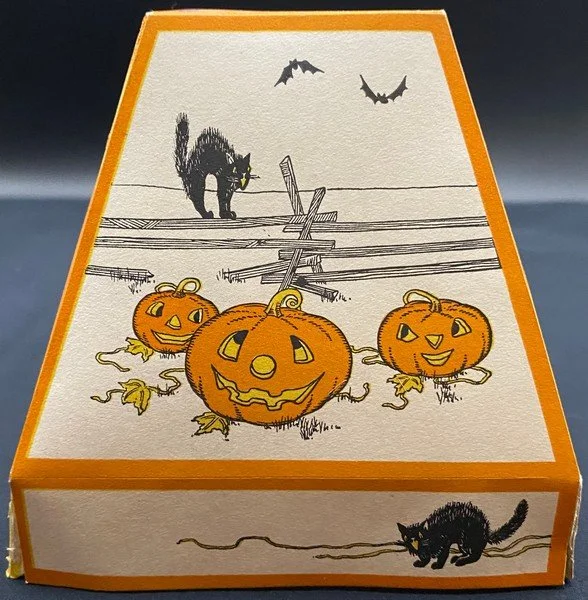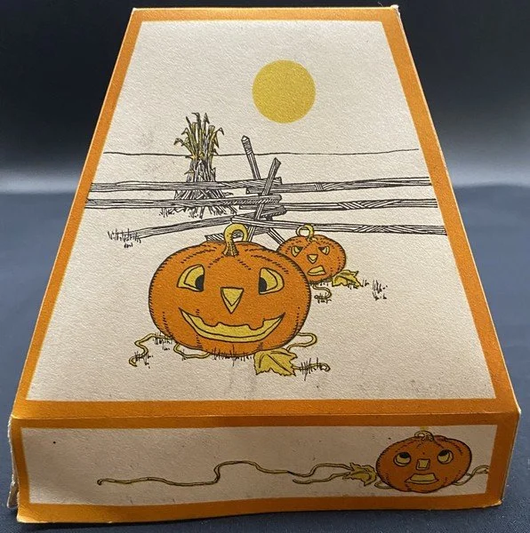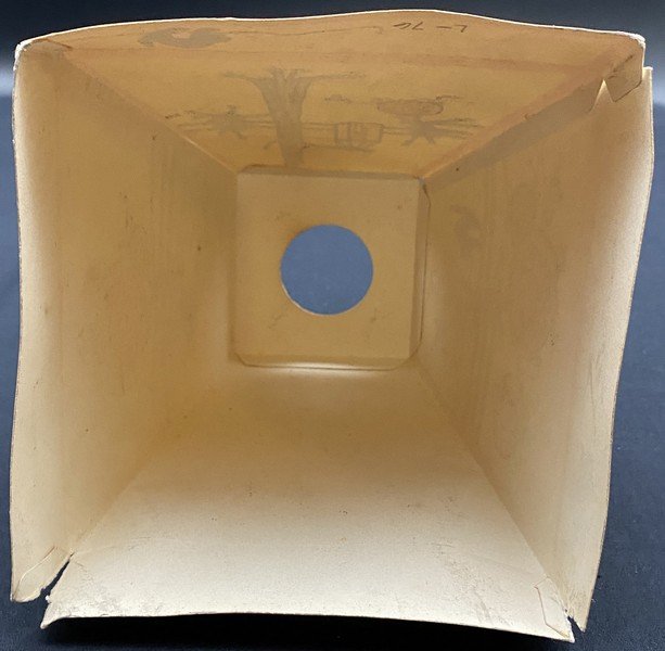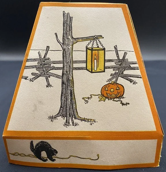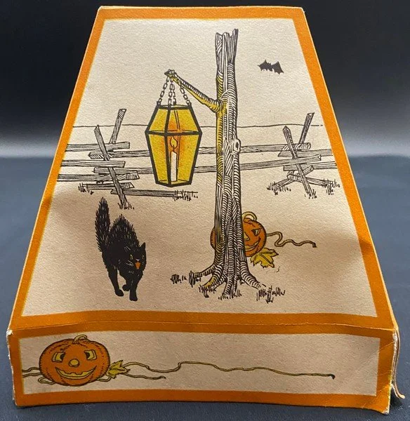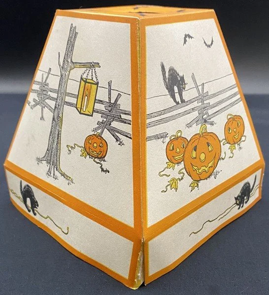 Gibson produced this rare shade during the early 1930s. One gets the sense that the artist had fun designing this. Each of the four panels, including the bottom rectangles, is different. The vague Western motif, the lone candle in the glass lantern on two panels and the bats that even migrate to the shade’s top are all very pleasing. The lantern measures ~4.25” high. Each panel measures ~4.5” high by ~4.5” across. There are several minor condition issues: two bottom corners have come apart; there is a .25” closed tear at the shade’s top and two panels have small areas of soiling. I haven’t seen a similar shade in decades. This is the very item photographed for my reference book, appearing on page 44 of the third edition. This entered the collection on April 30, 2001. The buyer will receive a handwritten note on my personal Halloween stationery attesting to this provenance.